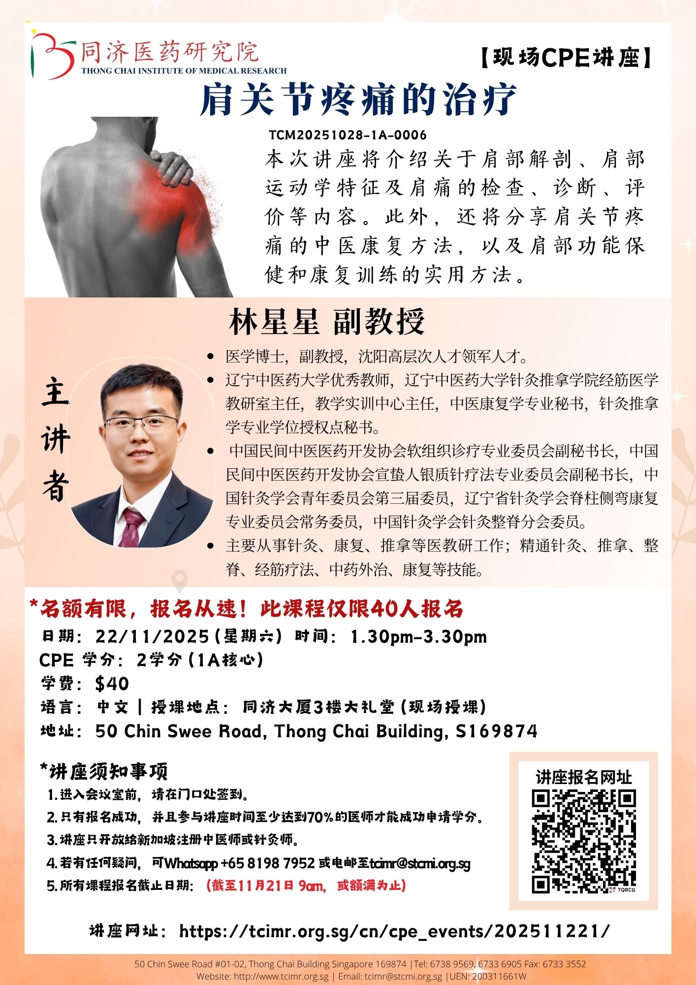 本次讲座将介绍关于肩部解剖、肩部运动学特征及肩痛的检查、诊断、评价等内容。此外,还将分享肩关节疼痛的中医康复方法,以及肩部功能保健和康复训练的实用方法。
